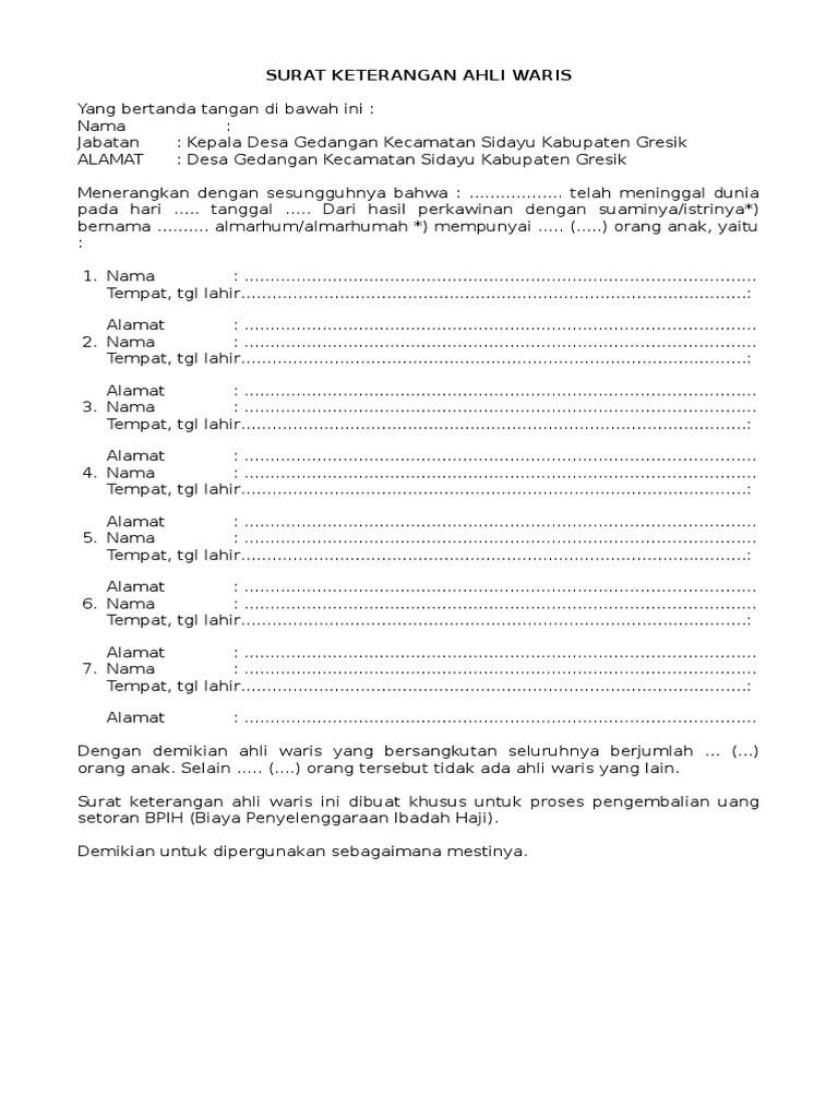 Fotokopi ktp dan kk para ahli waris. Penulisan surat kuasa ahli waris harus ditulis menggunakan tulisan tangan dan wajib di saksikan. Surat keterangan waris adalah surat yang diberikan oleh pemilik warisan kepada ahli warisnya. Surat keterangan usaha biasanya dibuat oleh kepala desa atau kelurahan setempat untuk memberikan informasi bahwa usaha tersebut surat keterangan ahli waris. Tanpa adanya surat keterangan ahli waris, seseorang yang merupakan ahli waris tidak bisa mengambil dan menguasai harta warisan peninggalan pewaris adapun beberapa hak khusus yang bisa didapatkan dari surat keterangan ahli waris ini adalah perubahan tindakan kepemilikan.